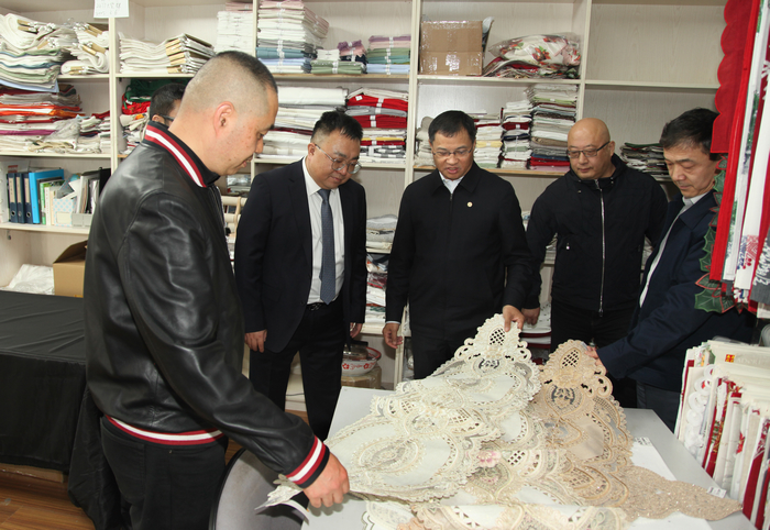 41日下午,中國紡織品進出口商會會長曹甲昌一行蒞臨公司調研指導,商會會員部主任代克勝、副主任苗青芳及法律部王偉屹陪同調研。